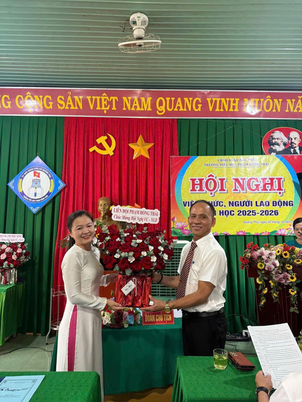 Ngày 22 tháng 10 năm 2025, Trường Tiểu học Phạm Hồng Thái đã tổ chức Hội nghị Cán bộ, Công chức, Viên chức (CBCCVC) năm học 2025-2026 trong không khí trang trọng và đầy ý nghĩa. Buổi hội nghị vinh dự được đón tiếp các đại biểu như bà H. Loan, Buôn trưởng Buôn Sút M’Rư; ông Bùi Thanh Thuận, Thôn trưởng Thôn 1; ông Nguyễn Văn Ninh, Trưởng ban đại diện CMHS; ông Trần Thanh Hải, Phó ban đại diện CMHS; và ông Nguyễn Văn Tiến, Thôn trưởng Thôn 4, đại diện hội CMHS của các lớp cùng toàn thể CBCCVC nhà trường.